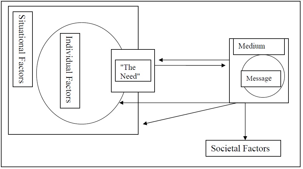 Here the need that prompts the media use is conceived of as being influenced by a combination of individual, situational and societal factors, which may in turn also be affected by aspects of the medium and the message. The medium and its message can also affect society, the situation and the user in other ways, which would influence the need indirectly. The strength of the relationship between the need and the medium, also defined as the user’s dependency on the medium, will be influenced by how the individual perceives the medium or its message as impacting the need, which would in turn be influenced by the situation and the society as the individual is nested in both. This relationship then on which UGP is founded then appears complex, but it is in complexity that the truth is known.