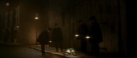 To an extent, the finding of this prostitute’s body has a convergence on the sensual level between both versions, but it apparently serves a different role in both. The butchering of the body, which begins in Chapter 5, page 30, of the novel, up to the discovery of the body, runs for approximately seven pages in the novel, but only a minute in the film, and then the film changes the ending of this scene. There is some attempt to match the cinematographic layout and disjointedness of the comic’s frames. Pages 34 to 36 of the comic are treated in the movie by using a similar angle on the body, although from a more street or eyelevel perspective and not aerial as in the comic books. As is someone walking down the street in the movie could come upon the body. The angle of the street, from the lower right to the upper left of the frame, remains the same. The directors then smoothed over the disjointedness by using a series of dissolves to indicate people coming and going from this shot. But whereas the framing of the body on the street remains constant in the graphic novel, the film moves the camera in closer to the body as time is sped up to the point where people are dissolving in and out of the frame in a near blur. It doesn’t stay on the body, but instead moves past it as time slows to allow Abberline to make his appearance on the crime scene.
