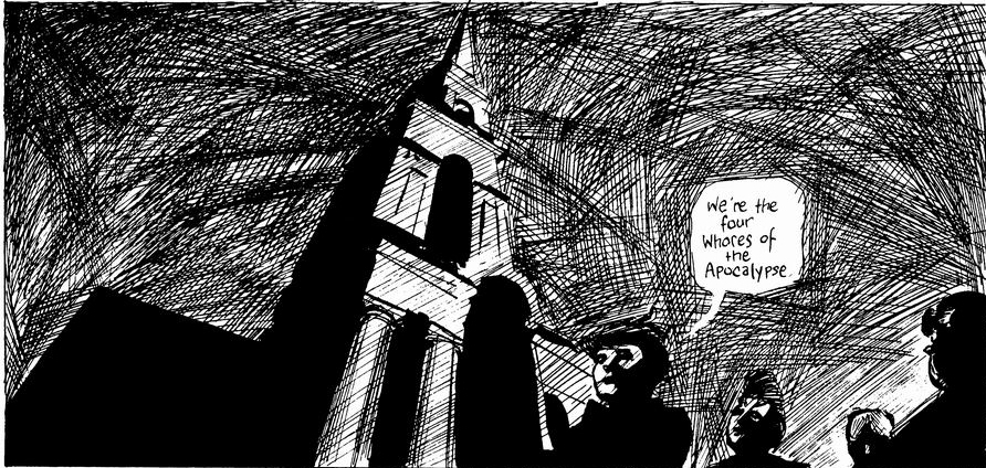 The first scene is as one of the prostitutes services a man in an alley and initially tries to fake the intercourse by not allowing full coital penetration. In the graphic novel, this scene occurs in one nine-panel layout on one page (Chapter 3, pg. 4). Only three frames, in the middle row, show constancy in the placement of the “camera”. In the film version, the whole scene is done in a long shot, which smoothes over the otherwise disjointed spatial aspects of the comic’s layout. The camera tracks the prostitute and the man from behind a wall so that they are revealed to the audience in a different way than portrayed in frame 2 of the comic. Instead of cutting to a close-up, the camera pushes in as the dialogue begins. The dialogue is largely an exact translation from textual to aural, but the moving camera changes our engagement with the scene. In the film, the camera continues to move closer and around the couple so that by the comic’s frame 5 we are looking over the shoulders at the woman, but then the woman is completely obscured by frame 6 when full coital penetration occurs. In the comic, we are able to still see the pained expression on the woman’s face at this point, but the film completely masks the woman’s pain as it comes to finally focus on the man’s hands in what would be comparable to the comic’s frame 7, only the woman has disappeared.