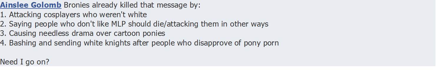 The cartoon series stresses friendship, tolerance, acceptance, understanding, and being yourself. These themes repeatedly appear in fan activity related to the series.  We have seen these themes appear in how fans, especially the bronies, will discuss their affection for the series, as well as in how they respond to instances of backlash to their being fans of the series.  The phrase “love and tolerate” is almost a mantra which fans are expected uphold, and a desire fans have for the public when it responds negatively to them.  However, no fandom is perfect because no person is perfect.  So what happens when your fandom does not live up to the ideals of the text to which it owes it’s existence?
