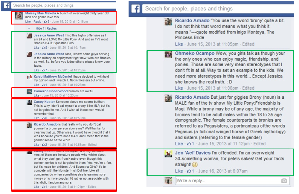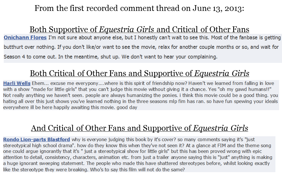 The same can be said for the polarization on another dimension, which is in respect to how the commenters reacted to other fans, either those posting on Facebook or to those in the fandom in general.  As with the other dimension, we can code these comments as being critical or being supportive of other fans.  For those who are more supportive, they indicate solidarity with other fans, are happy to see other fans expressing their opinions on the movie, or may even be defending other fans by saying everyone has a right to like whatever they like and thus have their own opinions.  However, for those who are more critical, they think people should see the movie before critiquing it, or they may consider those fans, often identified as the bronies, as acting too superior and forgetting that the series is, after all, a cartoon for girls.  In one sense, we see attempts at solidarity, which could be across the entire fandom, but could also be just within the one faction to which the commenter belongs.  Additionally, there are at times comments derived from perceptions of gender appropriateness, as those who are identified as not the target audience – or are the most distant from the target audience, such as the bronies – are discursively treated as “outsiders” whose opinions on the topic do not matter as much as those commenters who more closely resemble the target audience.