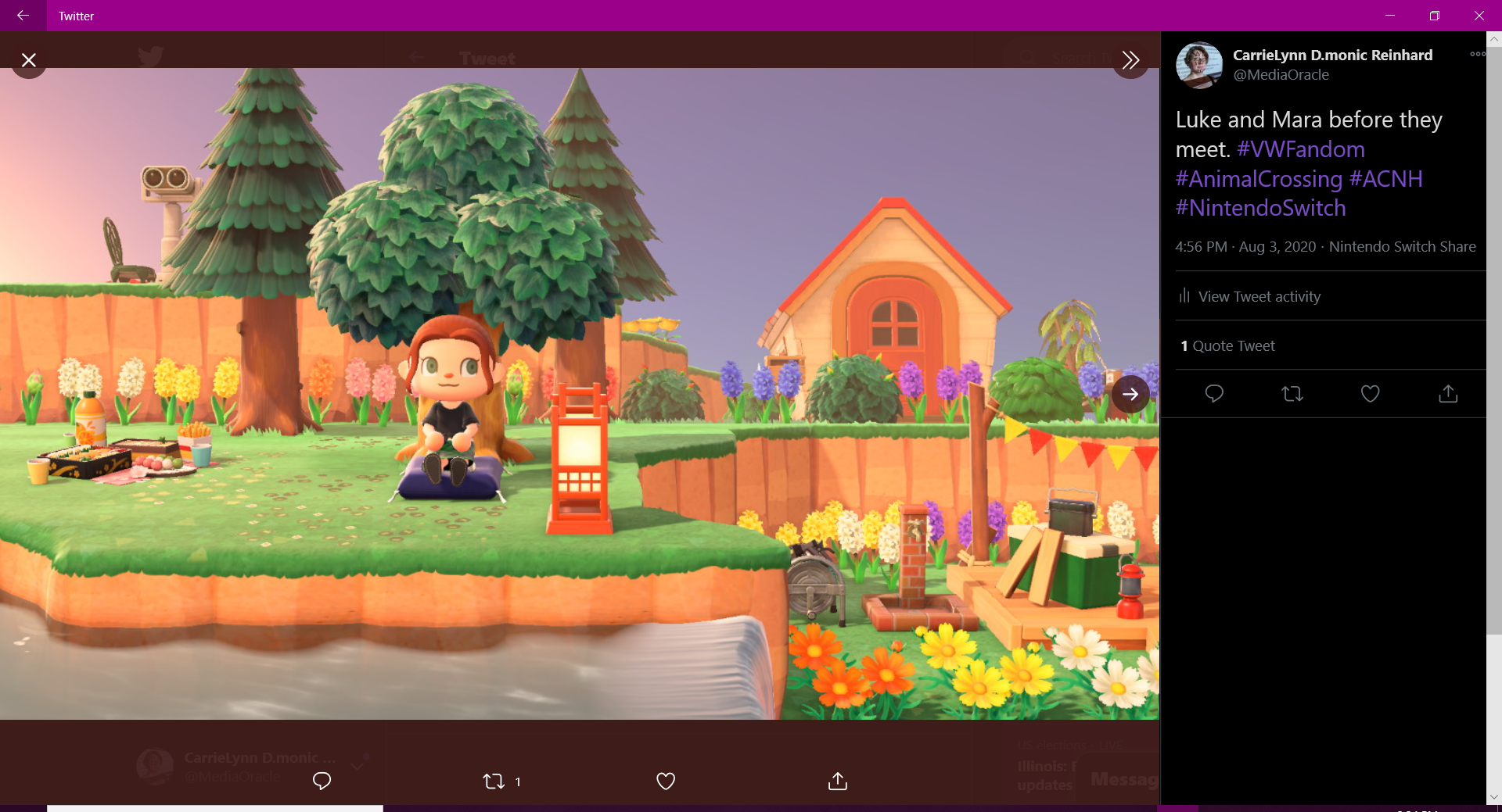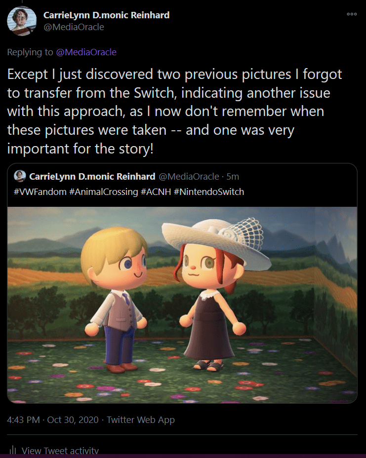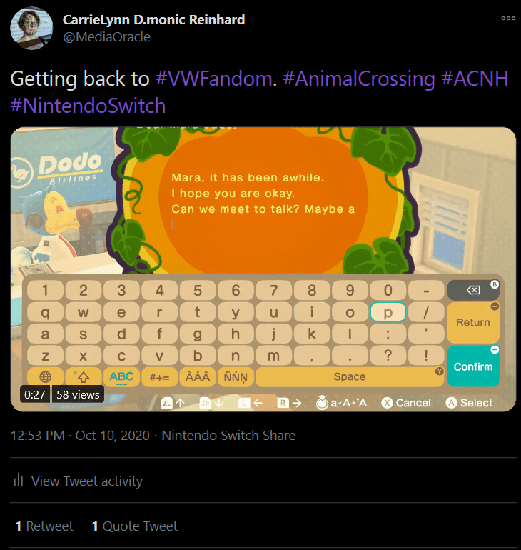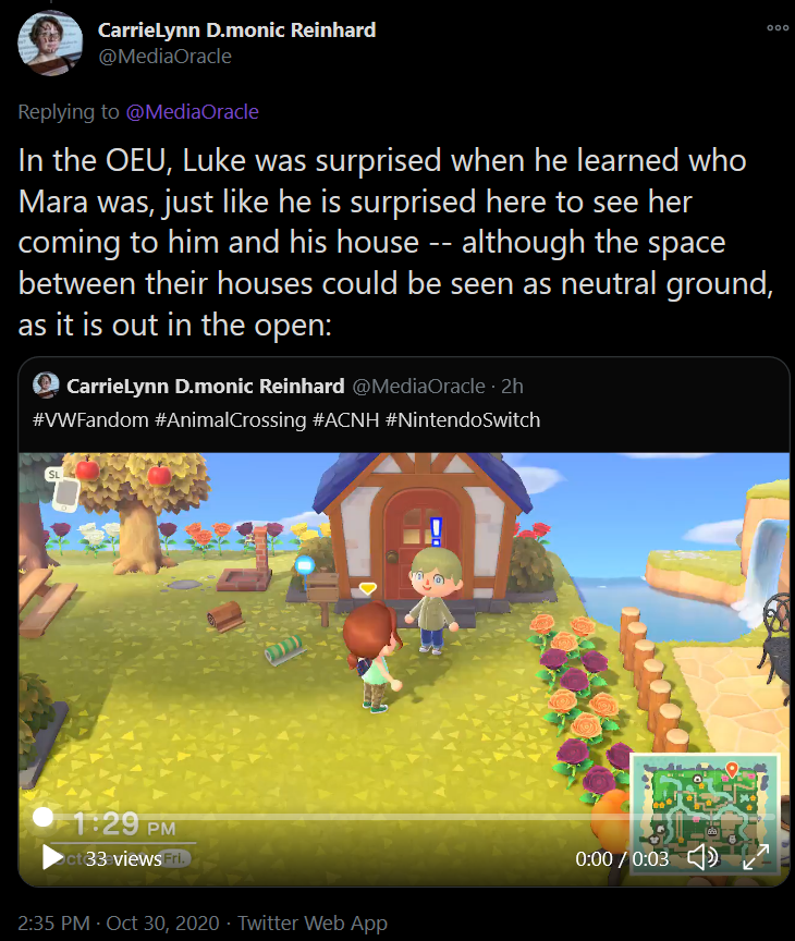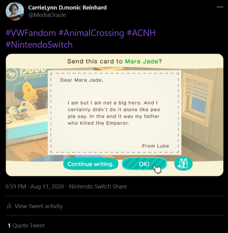 July 30, 2020: I decided to explore more this idea of fan re/creations in virtual worlds. So I created a sock puppet on the Switch to develop a new Animal Crossing: New Horizon resident that reflects the most impactful fandom in my life: Mara Jade from the first Star Wars expanded universe, as developed by Timothy Zahn (everyone focuses on his creation of Thrawn, but his Mara made such an impact on me growing up, and I told him so when I met him). Going to autoethnographically reflect on the experience.